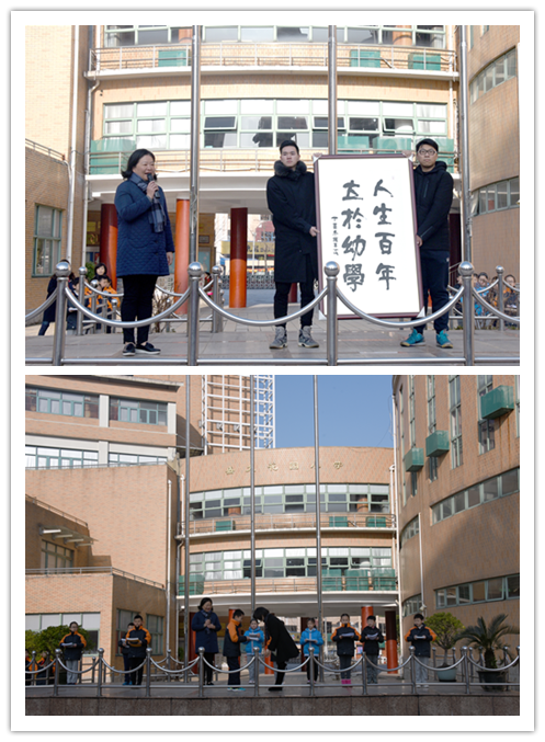 接着,龙华寺的方丈大师将自己亲笔题词的牌匾授予了盛大花园小学。匾上写着梁启超的话:“人生百年,立于幼学”。学生们集体吟诵着这两句话,深深感受到方丈对于自己的期盼之情。两年级的同学们也将自己的作文集授予了学校图书馆,记录下自己的成长足迹。