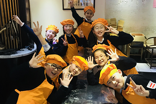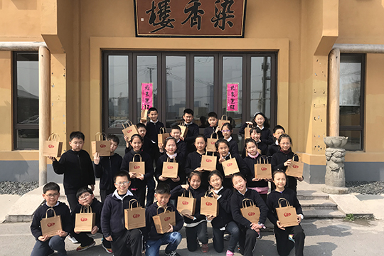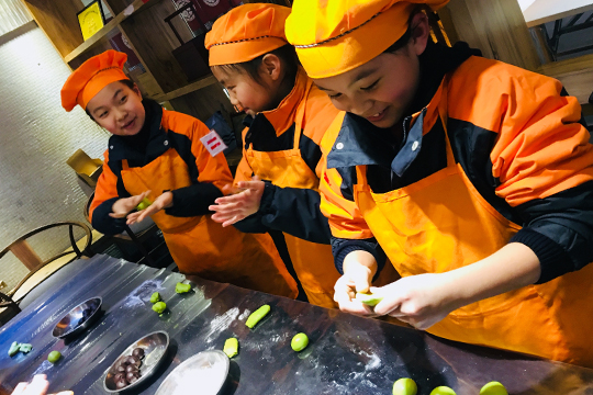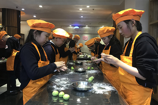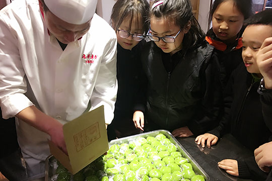 春光明媚的周四午后,四年级双语小班的二十多个孩子来到学校对面的龙华古寺素斋馆后厨体验学做青团的实践活动。素斋餐馆的点心师傅细心介绍并演示了一遍青团的做法,孩子们一个个兴趣盎然,跃跃欲试。戴上厨帽系上围裙,小点心师们有模有样地洗净双手,6人一组开始学做青团了。先把已经染好青汁的糯米长条,平均摘成四份,再反复揉透,然后边窝口边包入豆沙馅,捏拢收口,搓成圆球,最后洒上些干的糯米粉一个自己亲手制作的小青团就好了。经过15分钟的蒸煮,带着香气的青团出笼了。孩子们迫不及待地品尝起自己的“劳动成果”来,还表示要把第一次做的点心带回家送给家人品尝,表达自己满满的爱心。既了解了传统民俗文化,又学到了劳动技能,对孩子们来说这真是一次有意义的体验活动。