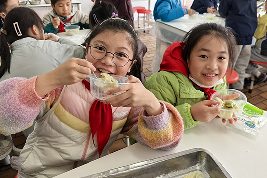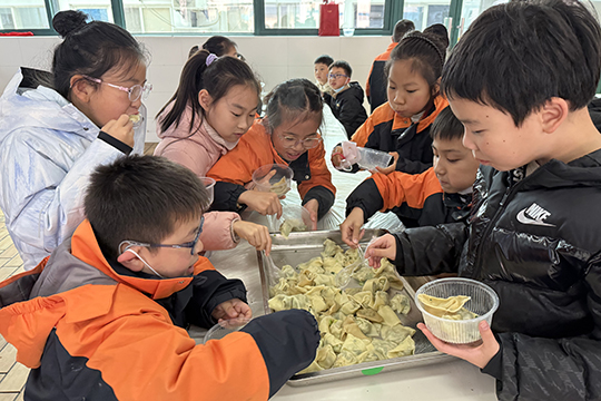 食堂阿姨将一盘盘馄饨下锅,沸水翻滚间,馄饨渐渐变得晶莹剔透。热气腾腾的馄饨端上桌,同学们争先恐后地拿起勺子品尝。当咬到甜丝丝的糖馄饨时,惊喜的欢呼声此起彼伏,吃到的同学满脸喜悦,没吃到的同学则笑着催促:“快找找还有没有了!”鲜香的肉馅馄饨暖了肠胃,甜蜜的糖馄饨甜了心窝,大家你一言我一语,分享着劳动的喜悦。