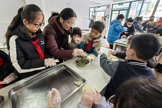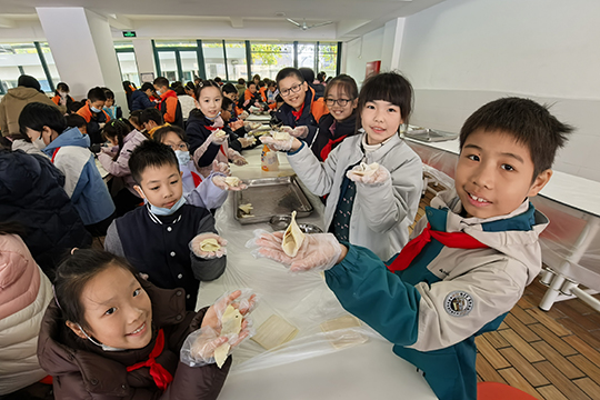 下午的食堂里热闹非凡,餐桌上铺着整洁的桌布,上面摆放着馄饨皮、馅料。同学们围坐在桌旁,迫不及待地戴上手套开始包馄饨啦!大家认真放馅、沾水、叠卷、捏皮,一点也不马虎。老师们穿梭在学生中间,耐心指导动作生疏的同学,还偷偷包了不少甜甜的糖馄饨混在其中。一会儿的功夫,一只只白白胖胖的馄饨就有模有样地立在了餐盘里,有的形似元宝,有的像蝴蝶,有的状如足球……看着自己包好的一盘盘馄饨,同学们的脸上洋溢着劳动的幸福感与自豪感。