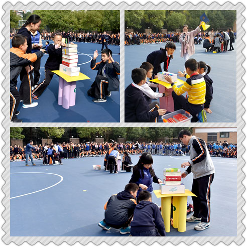 五年级进行的则是“结构承重”比赛。各班用相同的卡纸经过粘合做成不同形状、高度相同的立体柱子,在搭建的承重结构上面逐渐增加重物,直至承重结构坍塌,看哪个班的承重结构能坚持到最后。比赛过程中引导学生通过合作搭建承重结构,注意平衡和受力均匀。更多的让五年级学生了解不同形状的立柱有不同的承重能力,激发学生勇于探究、积极尝试的科学精神。当全场安顺倒数,最终曹老师宣布五(4)班和五(5)班取得并列第一时,大家不由为他们送去热烈的掌声!