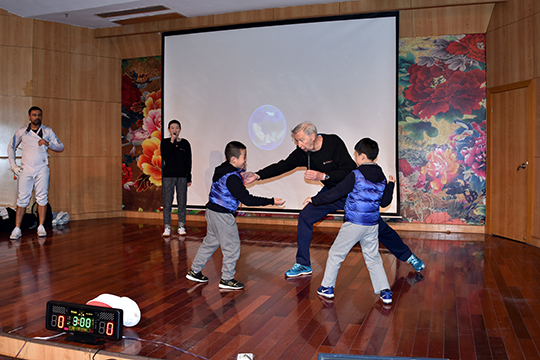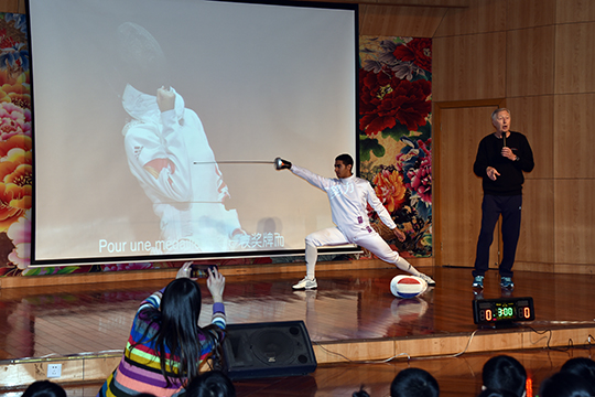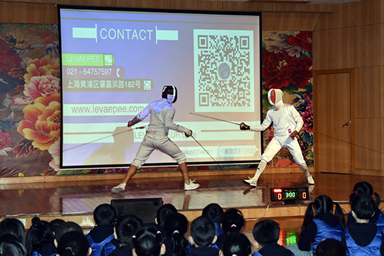 这次,瓦爷爷带着他的团队来到我们学校普及他钟爱的击剑运动。瓦爷爷告诉大家击剑运动是灵活的、优雅的、华丽的……瓦爷爷通过视频让大家了解到了他平时是如何训练运动员的。然后,瓦爷爷带的教练员现场就为大家展示了一次演练和比赛,让同学们看得直呼过瘾。接着,瓦爷爷还现场教授了击剑中的三个最基本的动作——前进、后退和刺。学生们有模有样地跟着教练们学习,各个都觉得新鲜有趣。
